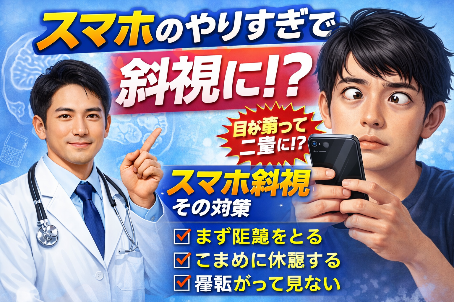 結論から言うと、スマホなどの近くを見る作業が長時間続くことが引き金になり、急に内斜視(目が内側に寄る)や複視(ものが二重に見える)を起こすケースが報告されています